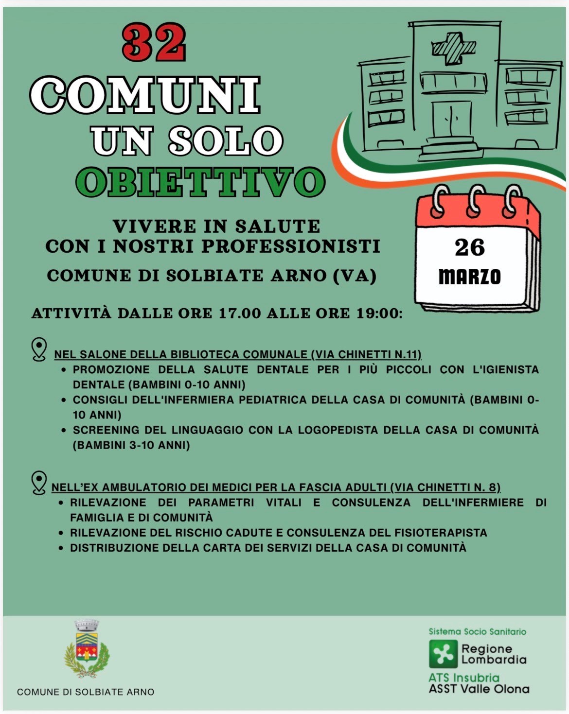 La Direzione Socio Sanitaria di ASST Valle Olona, in collaborazione con l'Amministrazione Comunale, propone una serie di attività e servizi dedicati alla promozione della salute pubblica quanto più possibile personalizzati sui bisogni rilevati, in modo da raggiungere capillarmente la popolazione e far conoscere i servizi svolti nelle Case di Comunità e sul Distretto.