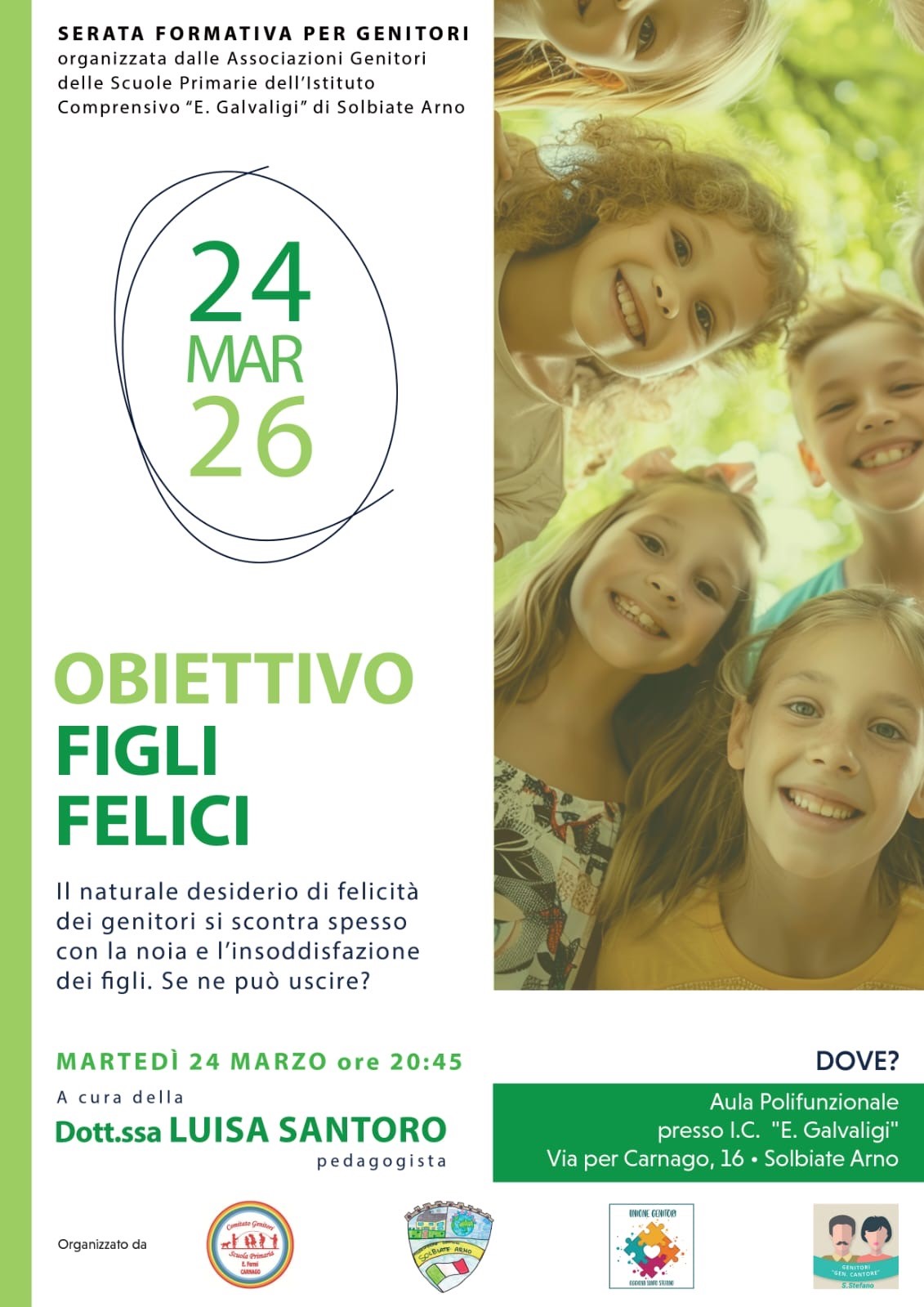 Pubblicato: 03 Marzo 2026 Condividi Facebook Twitter Google Plus Whatsapp Telegram Email OBIETTIVO FIGLI FELICI - SERATA FORMATIVA presso I.C. "E. GALVALIGI" martedì 24 marzo p. v. ore 20:45